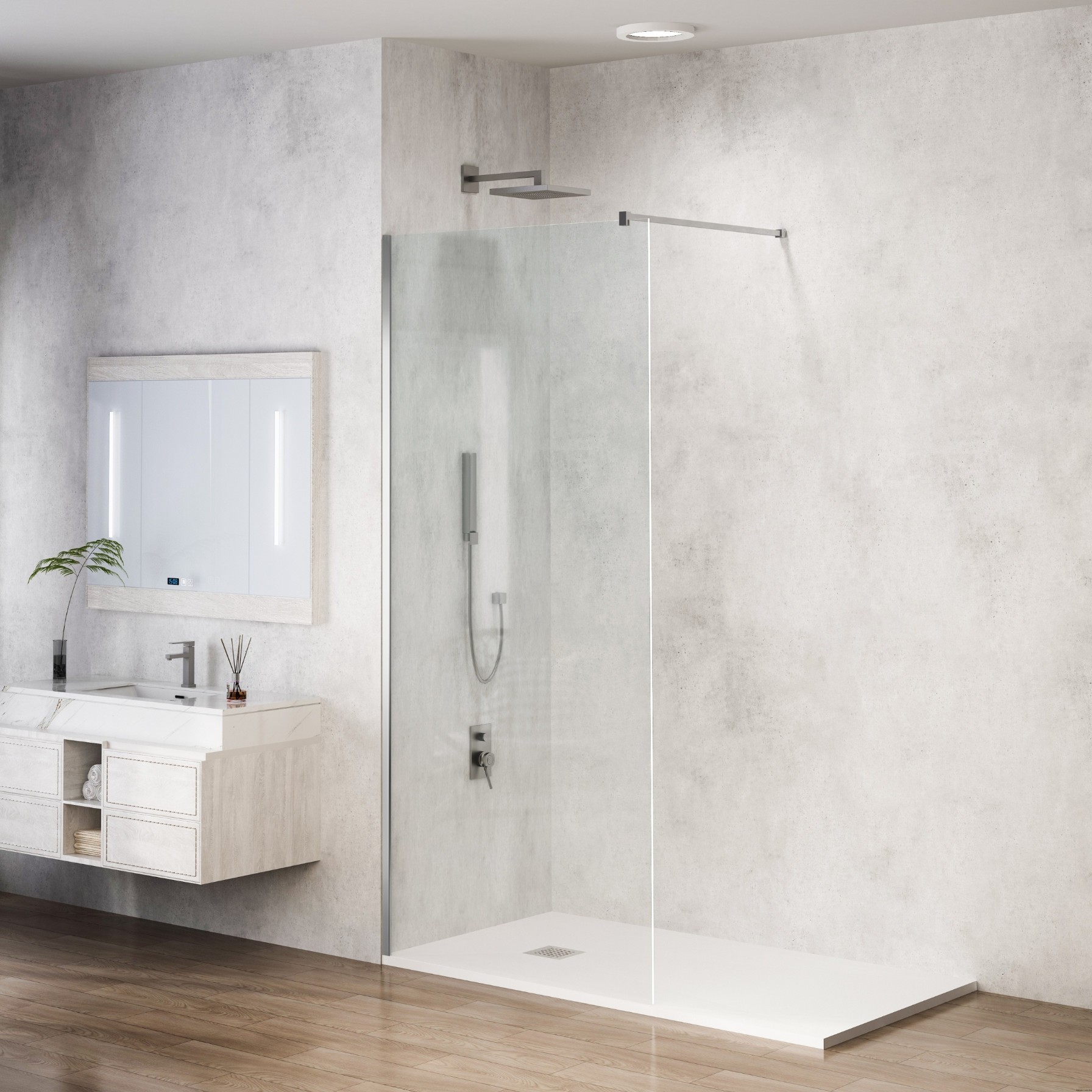 - W zestawie: Drążek usztywniający, profil ścienny, panel ze szkła hartowanego