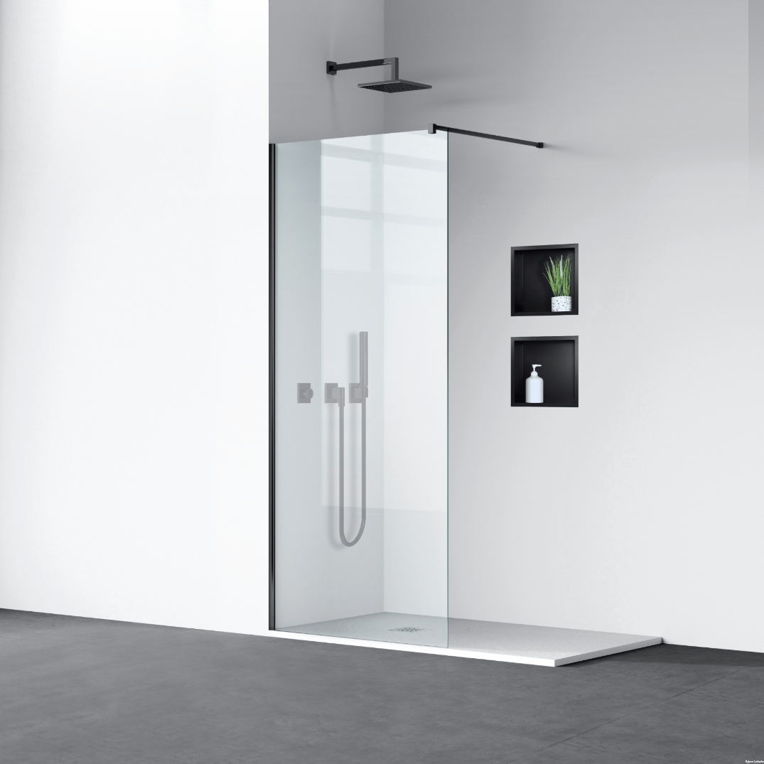 Montaż ścianki prysznicowej jest możliwy zarówno na podłodze, jak i na brodziku, co sprawia, że produkt jest wyjątkowo uniwersalny. Możliwość docięcia drążka pozwoli dostosować wymiar produktu do swoich potrzeb, zapewniając jednocześnie maksymalny komfort użytkowania. Dopełnieniem eleganckiego wyglądu są czarne profile oraz drążek usztywniający.