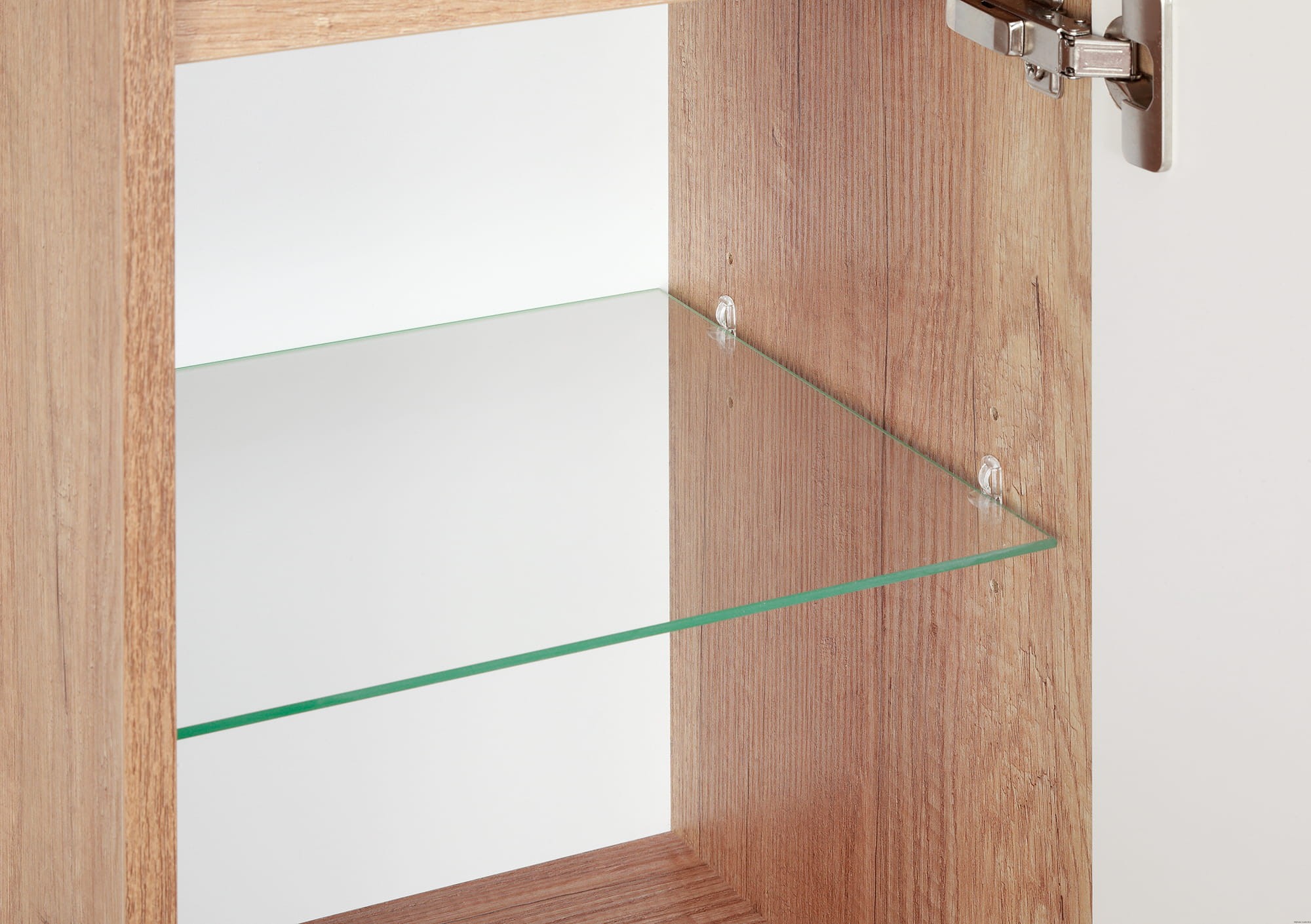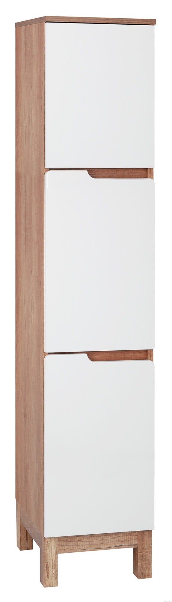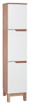 Słupek o szerokości 35 cm posiada troje drzwi i trzy półki szklane z regulacją wysokości. Korpus wykonany jest w kolorze drewna i został podparty na stylowej konstrukcji zawierającej cztery nogi. Wyposażone w system cichego domykania drzwi otwierane są za pomocą frezowanych w nich uchwytów. Na górze zaprojektowany został blat stanowiący dodatkową powierzchnię odkładczą na przedmioty codziennej higieny lub dekorujące łazienkę.