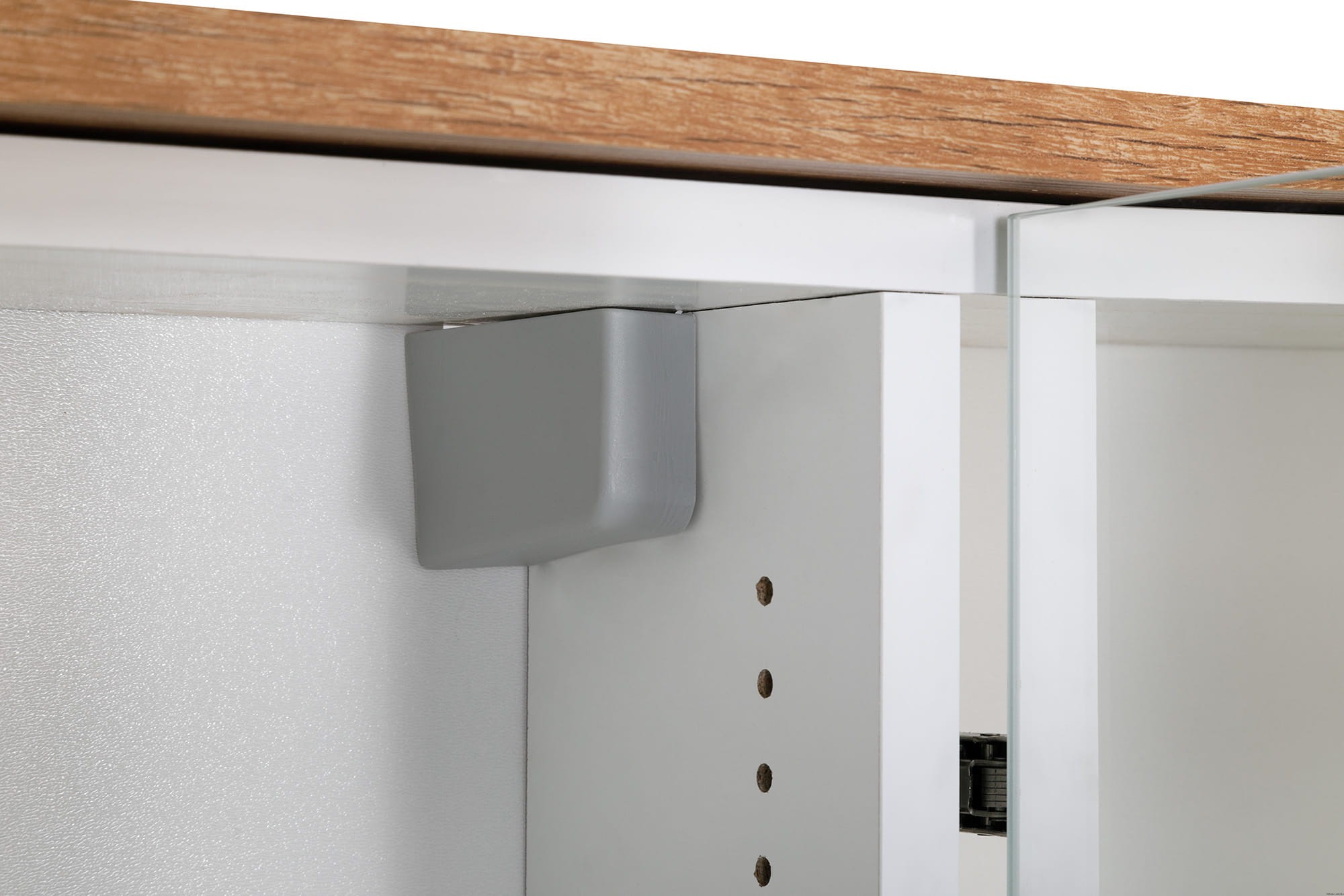 Szafka lustrzana o szerokości 60 cm posiada dwoje niesymetrycznych i uniwersalnych drzwi, które można zamieniać miejscami w zależności od preferencji użytkownika. Montaż do ściany odbywa się za pomocą regulowanych zawieszek montażowych, pozwalających w prosty sposób ją wypoziomować. Wewnątrz znajdują się dwie szklane półki z regulacją wysokości. Dopełnieniem wysokiej estetyki i ciekawego wzornictwa jest element dekoracyjny na górze szafki wykonany w kolorze drewna.