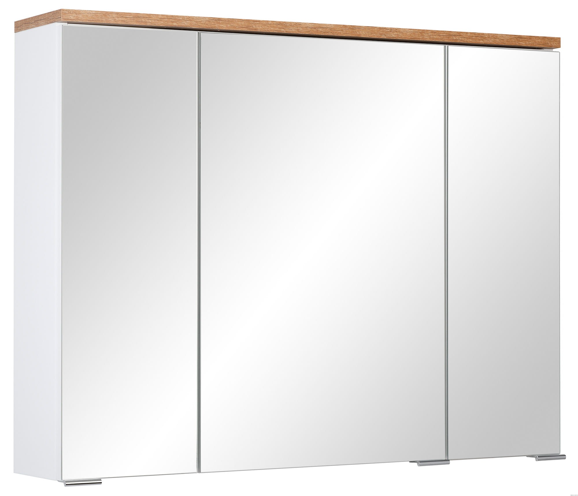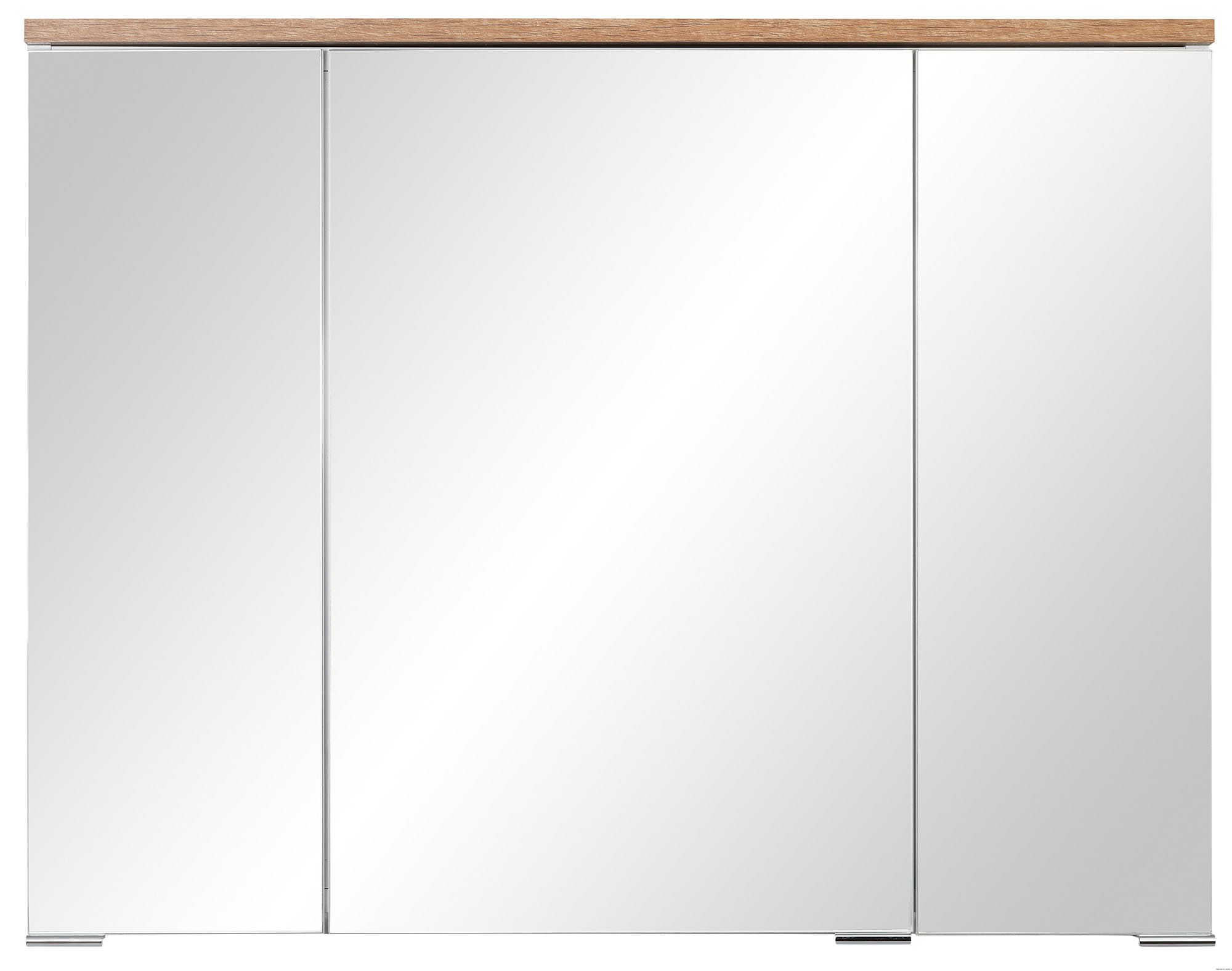 Szafka lustrzana o szerokości 80 cm posiada troje drzwi. Montaż do ściany odbywa się za pomocą regulowanych zawieszek montażowych, pozwalających w prosty sposób ją wypoziomować. Wewnątrz znajdują się szklane półki z regulacją wysokości. Dopełnieniem wysokiej estetyki i ciekawego wzornictwa jest element dekoracyjny na górze szafki wykonany w kolorze drewna.