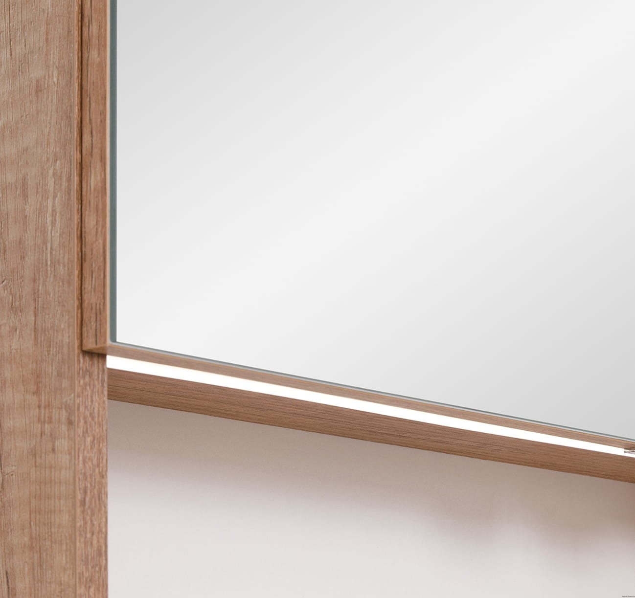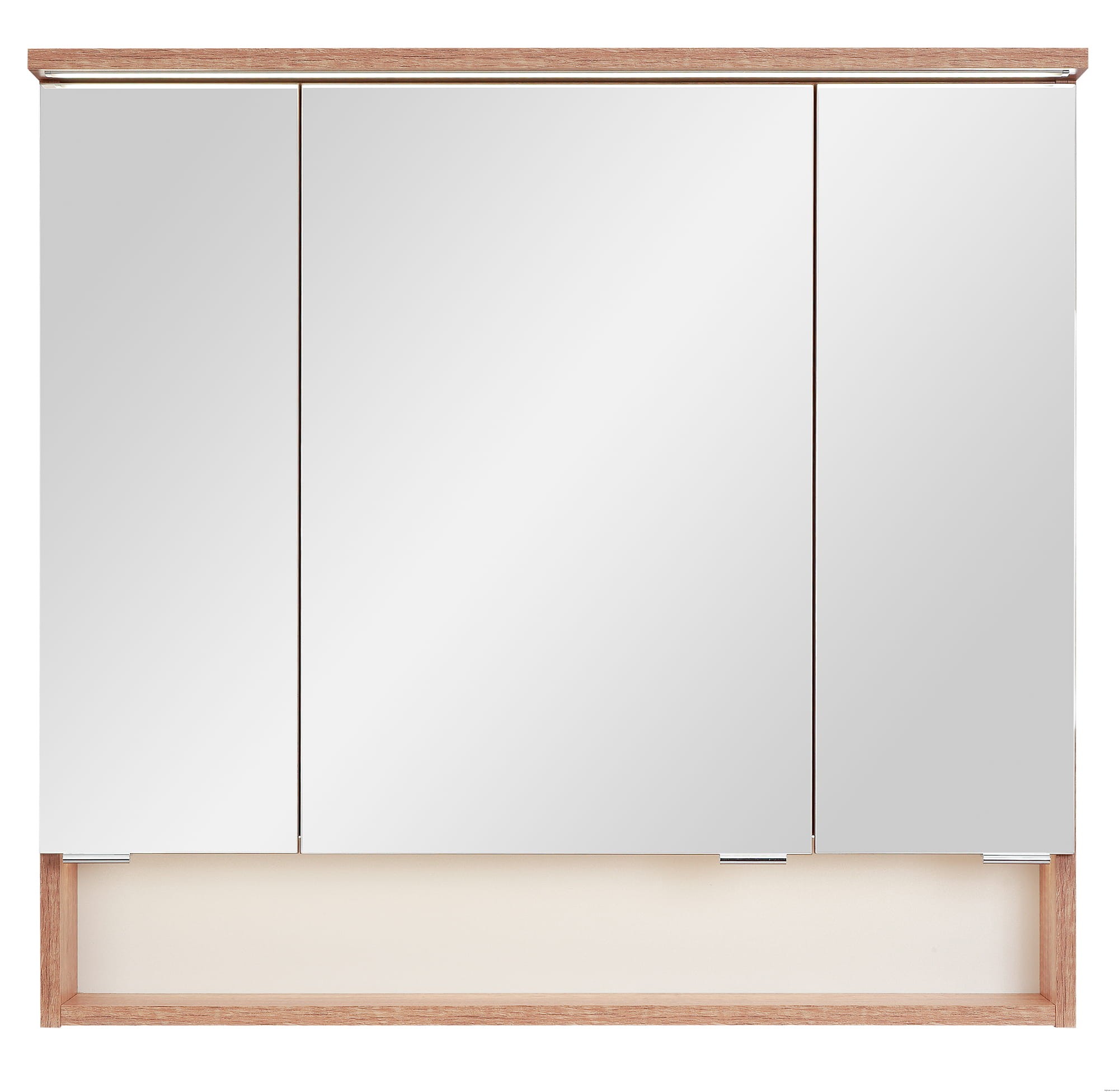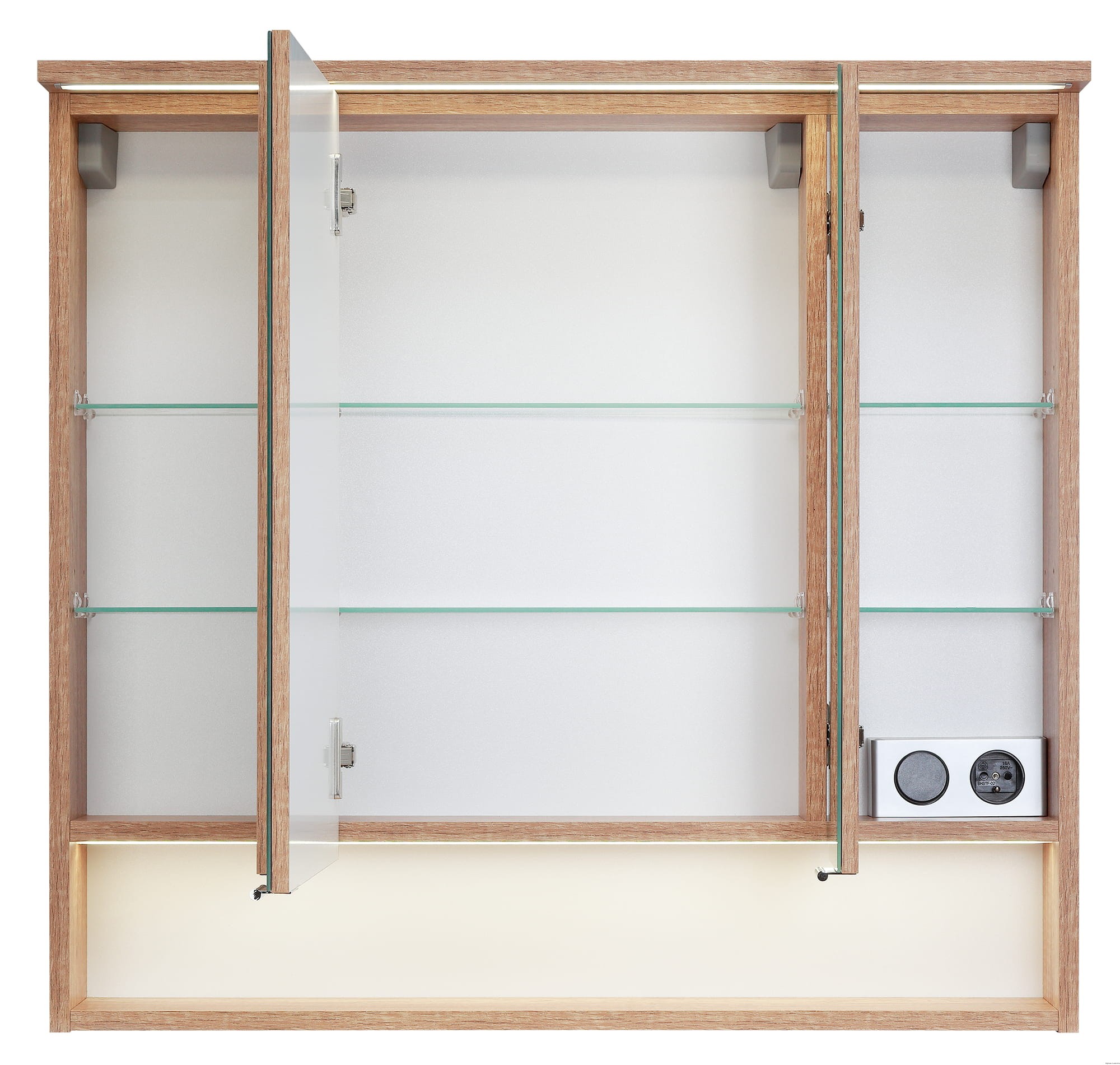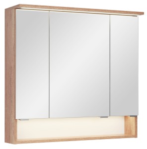 Szafka lustrzana o szerokości 80 cm posiada troje drzwi otwieranych za pomocą eleganckich metalowych uchwytów w kolorze chromu. Montaż do ściany odbywa się za pomocą regulowanych zawieszek montażowych, pozwalających w prosty sposób ją wypoziomować. Wewnątrz znajdują się szklane półki z regulacją wysokości. Szafka jest wyposażona w prostokątną rampę z oświetleniowym paskiem LED oraz dolną półkę oświetlaną w ten sam sposób.