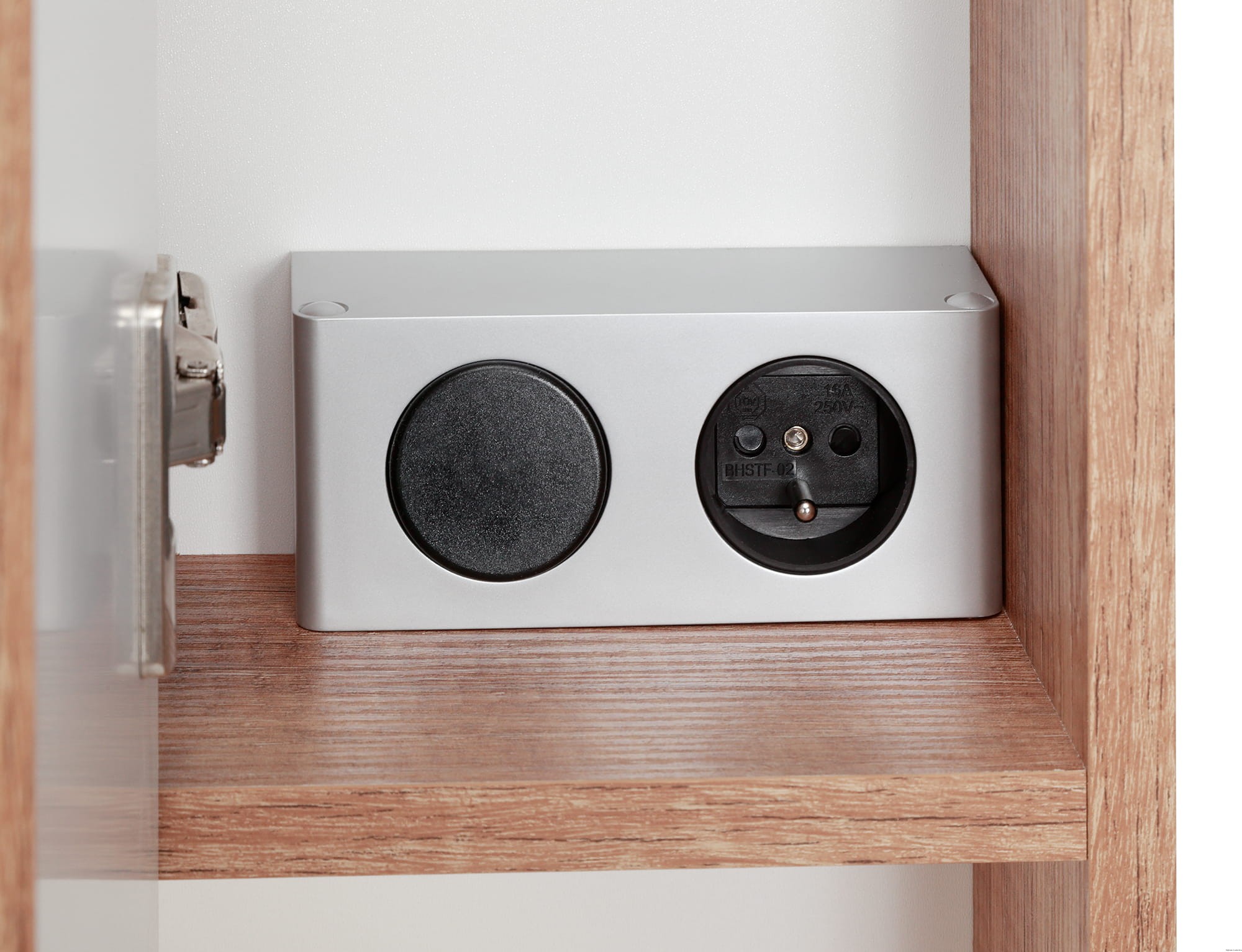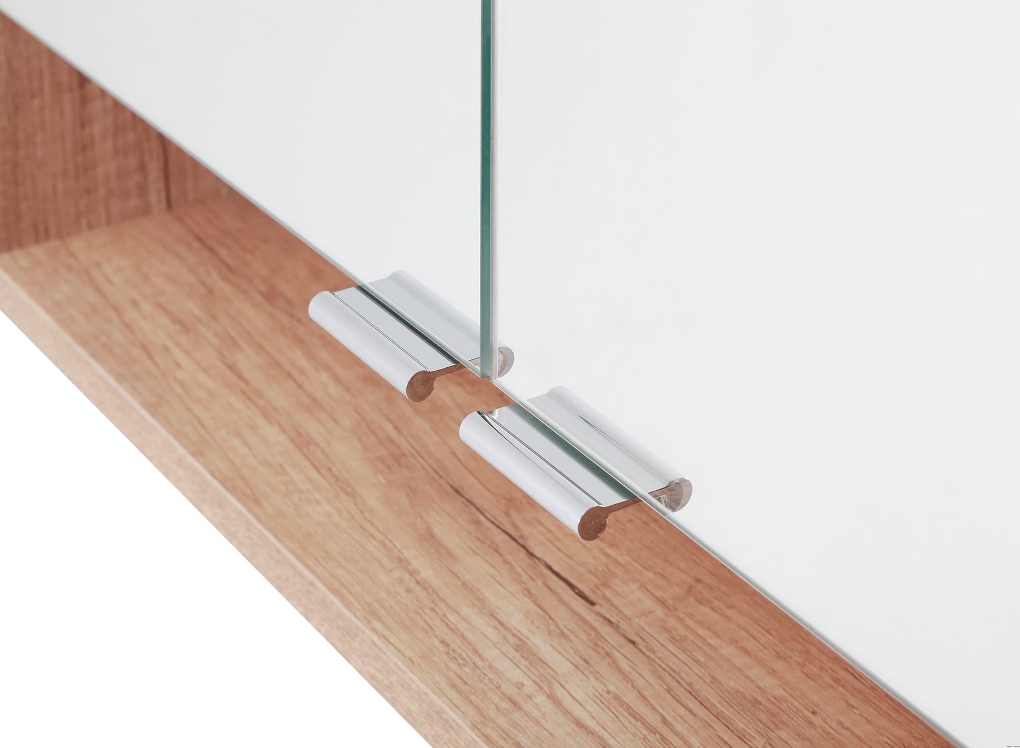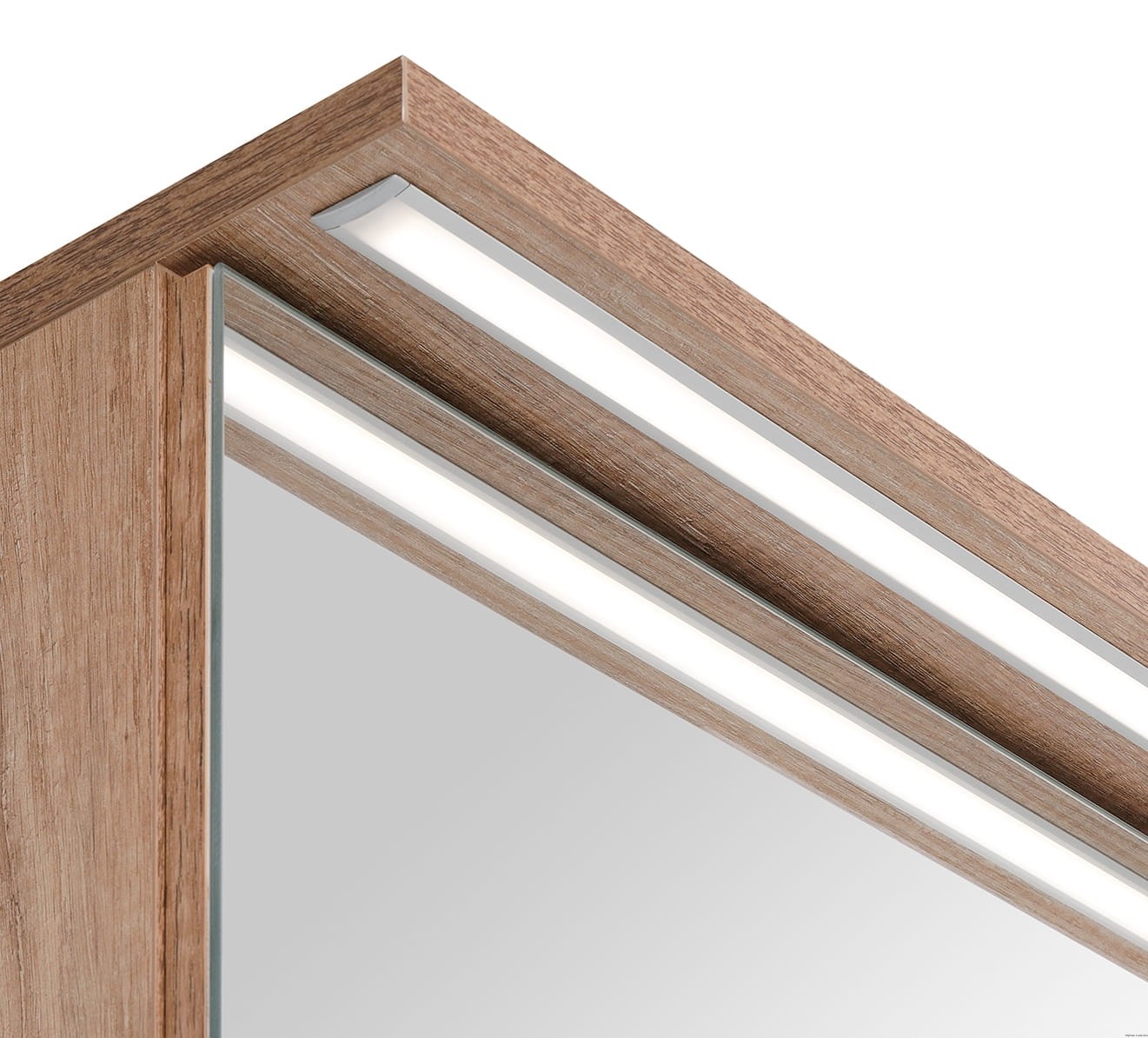 Szafka lustrzana o szerokości 80 cm posiada troje drzwi otwieranych za pomocą eleganckich metalowych uchwytów w kolorze chromu. Montaż do ściany odbywa się za pomocą regulowanych zawieszek montażowych, pozwalających w prosty sposób ją wypoziomować. Wewnątrz znajdują się szklane półki z regulacją wysokości. Szafka jest wyposażona w prostokątną rampę z oświetleniowym paskiem LED oraz dolną półkę oświetlaną w ten sam sposób.