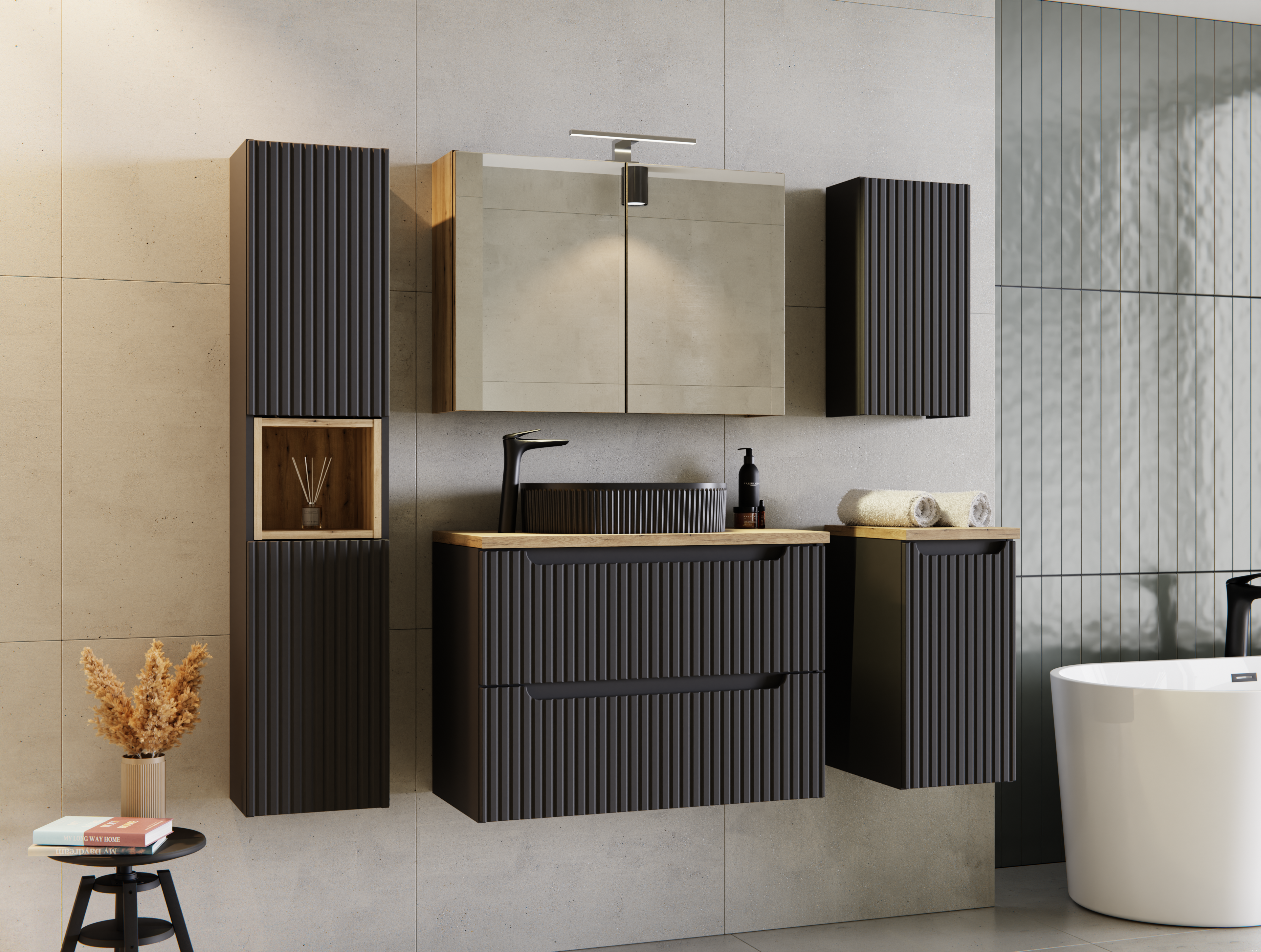 Producent ComadZestaw meblowy 120cm z umywalką nablatową i szafką wysoką Nova Black, producent: Comad, nr kat.: SETNOB B OAK 120CM UN BEYOND 5 WH HC