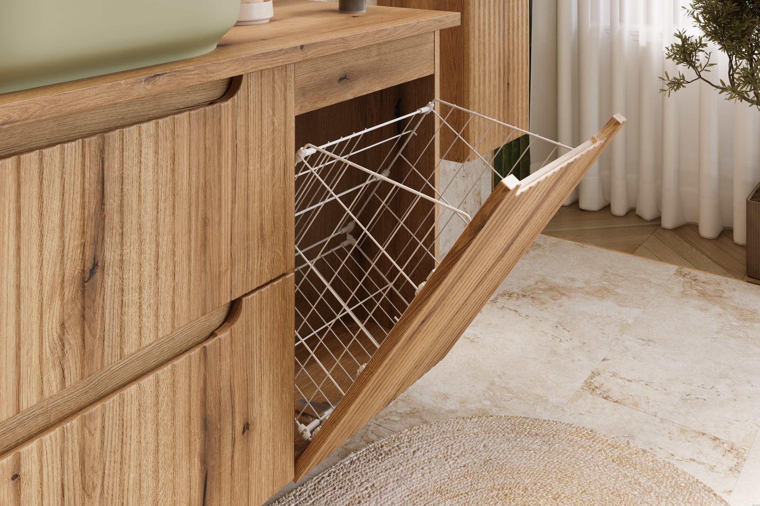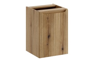 Szafka pod blat o szerokości 40 cm z koszem na pranie z kolekcji Nova Coast Evoke przyciąga wzrok eleganckim minimalizmem, wyrazistymi pionowymi ryflowaniami i perfekcyjnie zintegrowanym podchwytem, który subtelnie podkreśla ponadczasowy charakter mebli. Ciepły odcień i naturalna struktura dekoru Dąb Coast Evoke sprawiają, że wnętrze nabiera miękkiego, przytulnego charakteru. Kompatybilność z pozostałymi seriami Nova – w kolorach kaszmiru, bieli, czerni oraz niebieskiego Denimu – pozwala na pełną swobodę aranżacyjną i tworzenie spójnych, ale niepowtarzalnych przestrzeni.