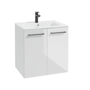 Wisząca szafka podumywalkowa METRO SYSTEM D60 posiada dwoje drzwi wyposażonych w funkcję cichego domykania soft close. Zastosowany wysokiej jakości lakier światłoutwardzalny na korpusie i froncie podnosi odporność na promieniowanie słoneczne. Relingowy, czarny uchwyt pięknie podkreślaja geometryczną formę mebli.