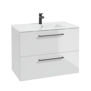 Wisząca szafka podumywalkowa METRO SYSTEM D80 składa się z dwóch szuflad wyposażonych w funkcję cichego domykania soft close. Zastosowany wysokiej jakości lakier światłoutwardzalny na korpusie i froncie podnosi odporność na promieniowanie słoneczne. Relingowy, czarny uchwyt pięknie podkreślaja geometryczną formę mebli.
