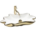 Umywalka wykonana z najwyższej jakości ceramiki w białym kolorze i owalnym, pofalowanym kształcie. Umywalka wykończona złotym rantem, co nadaje piękny efekt końcowy. Umywalka jest niesamowicie atrakcyjna dla oka, jest idealna dla miłośników niestandardowych kształtów, wnosząc elegancję do aranżacji łazienki w domu i biurze.