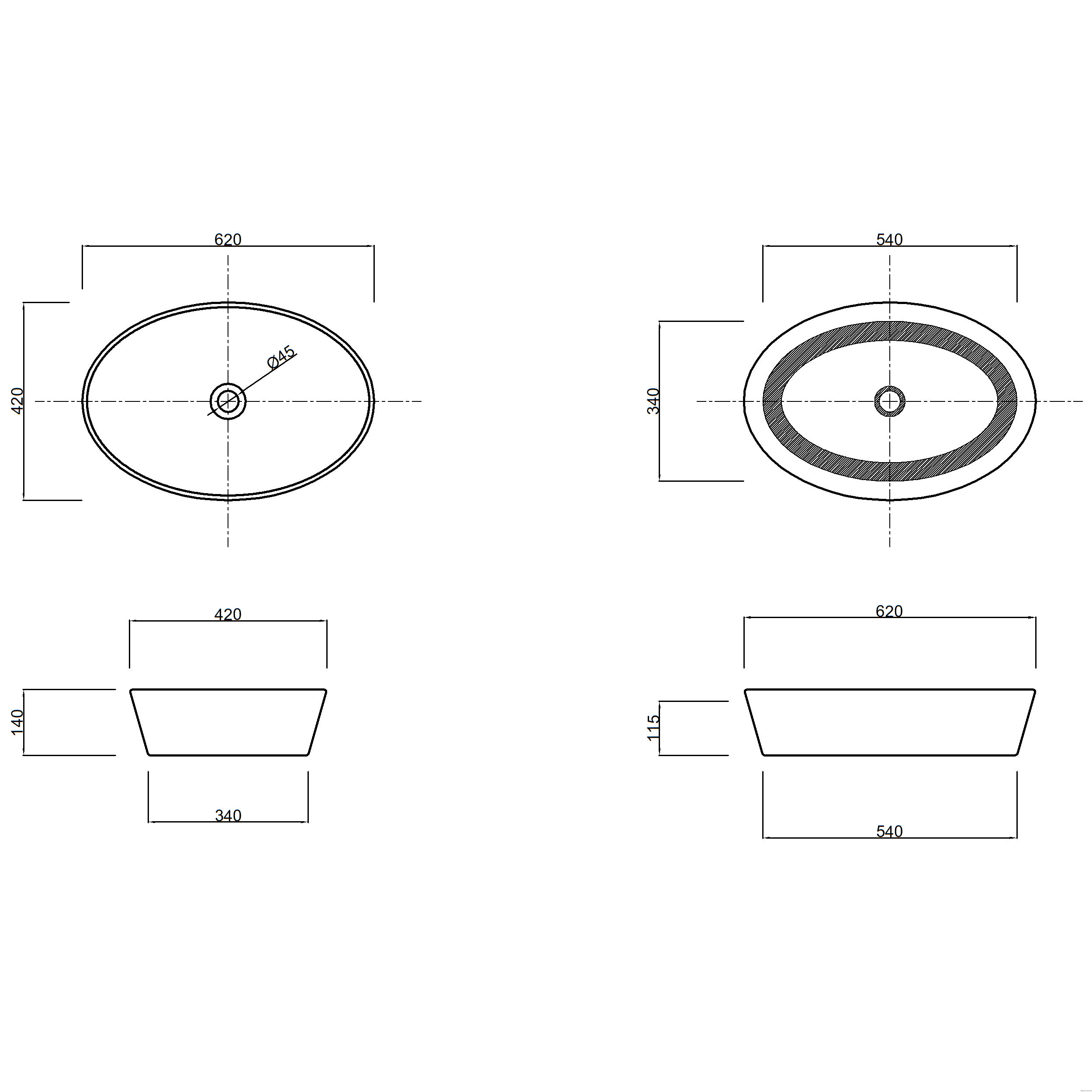 Stawiana na blat, owalna. Otwór przelewowy: nie. Otwór na baterię: nie. Korek w komplecie: nie. Wymiary: 61 x 41 x 14,5 cm. Głębokość wewnętrzna misy:x 11,5 cm. Kolor: biały mat z efektem marmuru (brąz). Do kompletowania z bateriami wysokimi lub bateriami podtynkowymi oraz korkami click-clack
