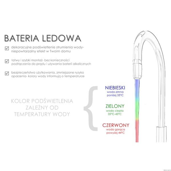 - Chromowane wykończenie – wysokiej klasy technologia sprawia, że bateria charakteryzuje się nienaganną jakością oraz nieskazitelnym wyglądem