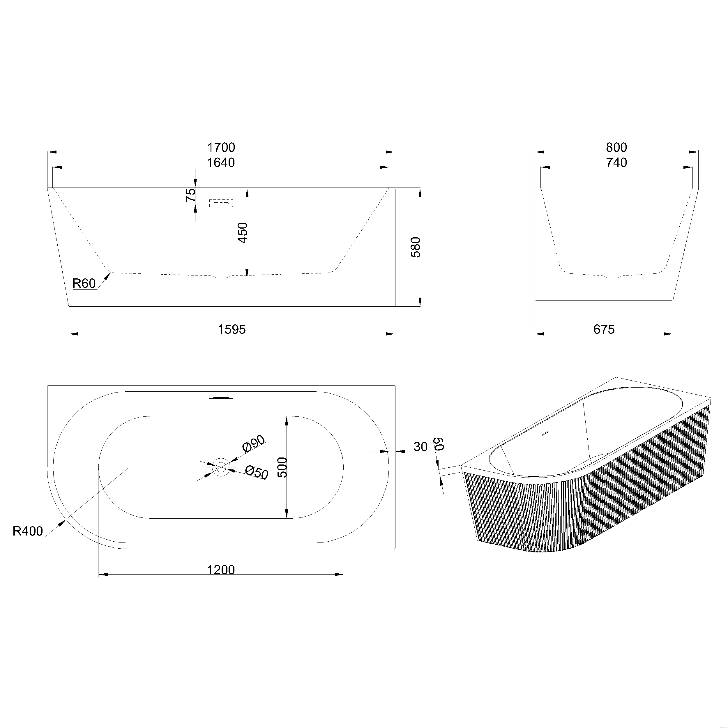 Wanna wolnostojąca przyścienna, ryflowana 170 cm, prawostronna.. Wymiary: 170 cm x 80 cm x 58 cm. Materiał: Akryl. Grubość ścianki: ~ 8 mm. Stelaż: Stelaż posiada regulowane punkty podparcia (nóżki), które umożliwia wypoziomowanie wanny.. Konstrukcja: wzmacniana, maksymalne obciążenie do 800 kg. Pojemność: 250 l. Syfon i odpływ w zestawie: TAK. Umiejscowienie odpływu: środek wanny. Korek i przelew w zestawie: TAK