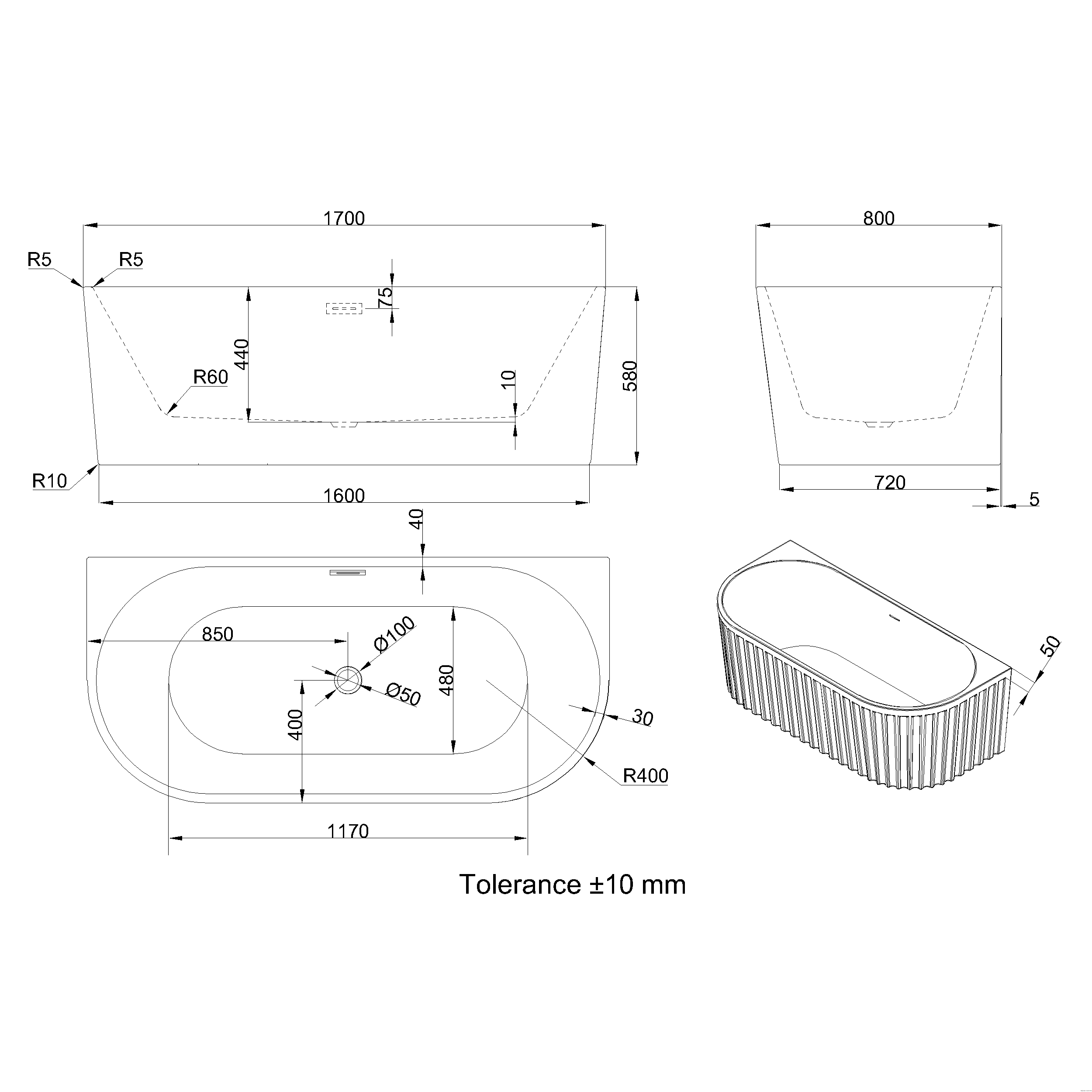 Wanna wolnostojąca przyścienna, ryflowana 170 cm.. Wymiary: 170 cm x 80 cm x 58 cm. Materiał: Akryl. Grubość ścianki: ~ 8 mm. Stelaż: Stelaż posiada regulowane punkty podparcia (nóżki), które umożliwia wypoziomowanie wanny.. Konstrukcja: wzmacniana, maksymalne obciążenie do 800 kg. Pojemność: 256 l. Syfon i odpływ w zestawie: TAK. Umiejscowienie odpływu: środek wanny. Korek i przelew w zestawie: TAK