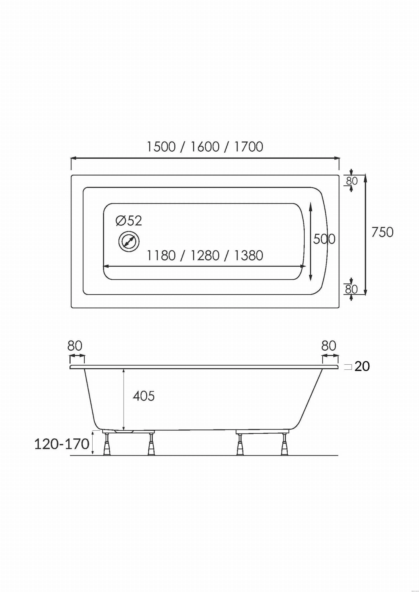 Wanna akrylowa Standard Plus Praia 150x75x57 cm, prostokątna ze stelażem, produkcji Schedline, nr kat.: 3WST.P1P-15075