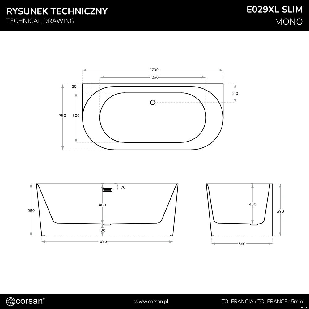 Wanna przyścienna MONO Slim 170 cm korek klik klak biały E029XLSWH Corsan