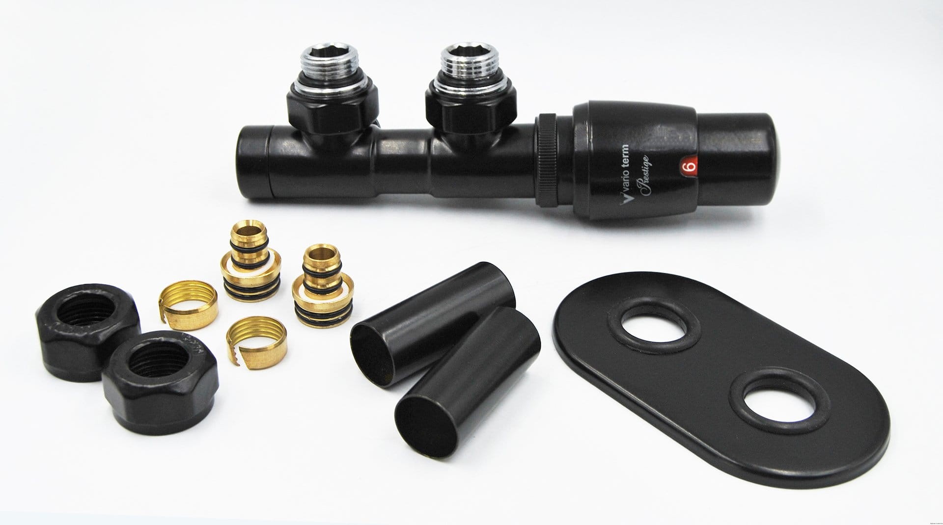 W zestawie: 1 x przyłącze termostatyczne lewe lub prawe, 1 x głowica termostatyczna „Prestige”, 1 x rozeta maskująca zespolona, 2 x tuleja maskująca, 2 x adapter/złączka na PEX lub Cu.