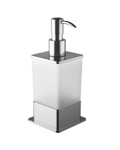 Dozownik do mydła w płynie stojący RIKO składa się z metalowej podstawki oraz pojemnika wykonanego ze szkła mrożonego wyposażonego w pompkę umożliwiającą dozowanie mydła w płynie. Metalowa podstawka wyposażona jest w plastikową obręcz zabezpieczającą szklany element przed uszkodzeniem. Podstawka posiada specjalne naklejki chroniąca powierzchnię przed zarysowaniem.