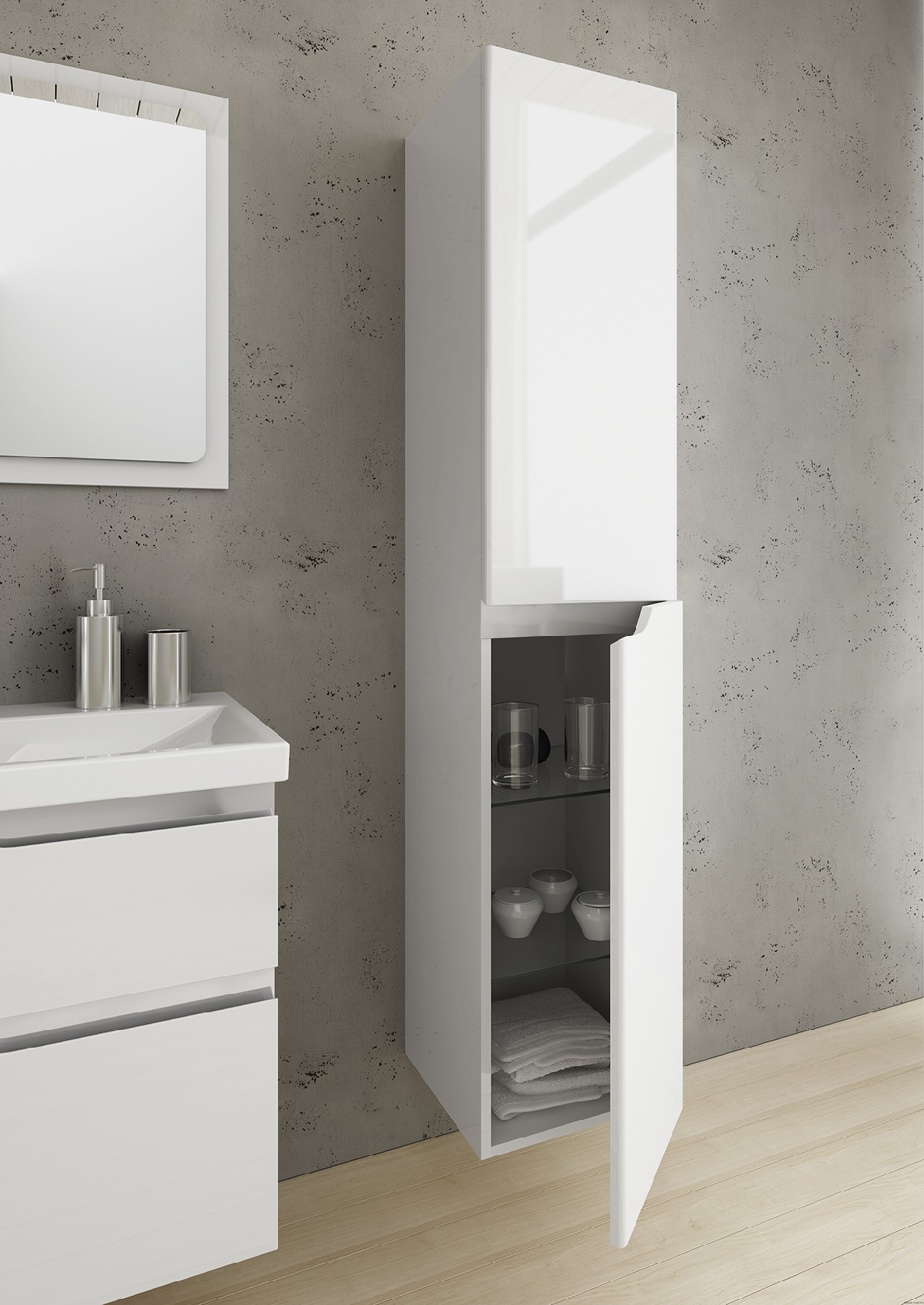 Słupek wiszący z kolekcji Koda w kolorze biały połysk wyprodukowany przez firmę New Trendy. Jest to wyjątkowo funkcjonalna szafka, która posiada szklane półki do dowolnej regulacji. Nadaje unikalny charakter każdej łazience.