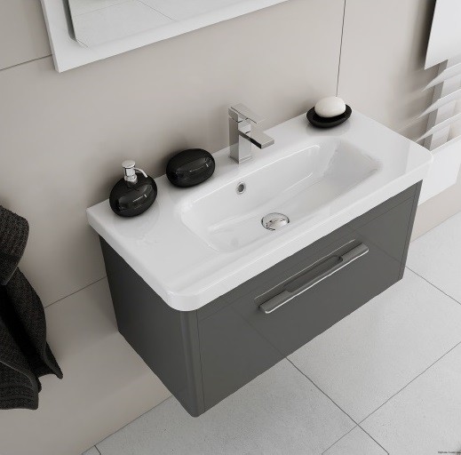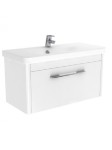 Zestaw mebli łazienkowych z kolekcji Vito w kolorze biały połysk wyprodukowany przez firmę New Trendy. Na zestaw składa się szafka podumywalkowa wyposażona w szufladę i umywalka, które wzajemnie świetnie się komponują. Szuflada z eleganckim, czarnym wykończeniem i delikatnie zaokrąglonych krawędziach.